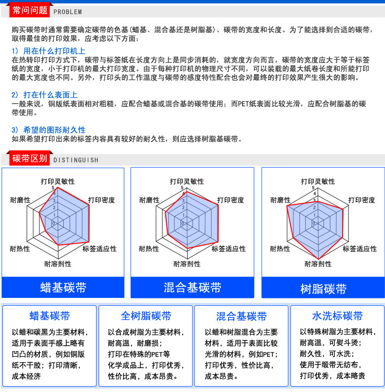 | B110CB | 黑 | 树脂基 | 100℃(212F) | 可承受100℃下粗糙纸的摩擦,抗溶剂性强 (乙醇、煤油、机油),颜色特黑,有杰出 打印效果 | 在铜版纸上也能打印出杰出效果,广泛用于 各种膜类、铭牌打印 |
